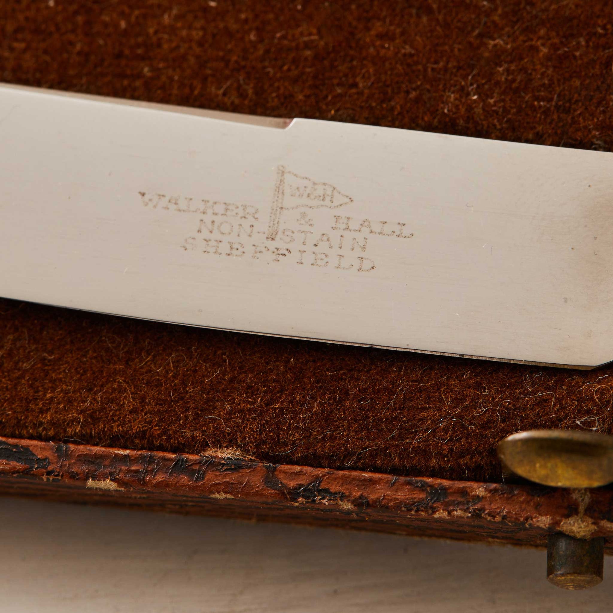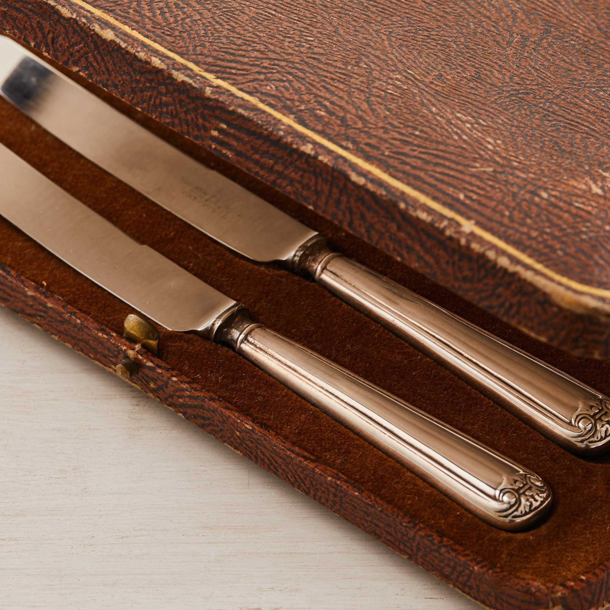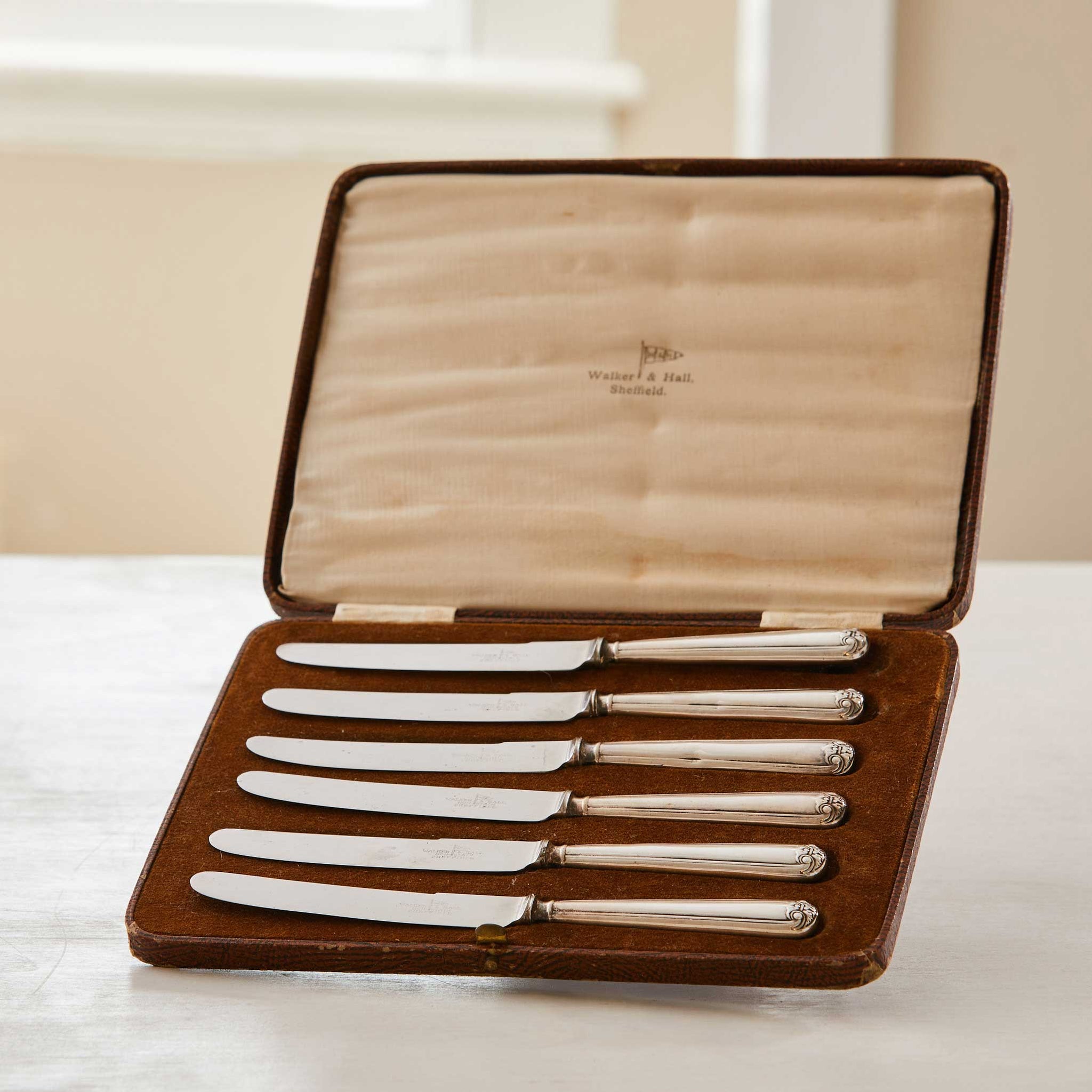 In its original case, this set of spreaders are marked "Walker & Hall, Sheffield." Walker & Hall is an historic Sheffield-based silversmith founded in 1845. The spreaders are defined by an abstract fleur-de-lis design at the tip of the handle.