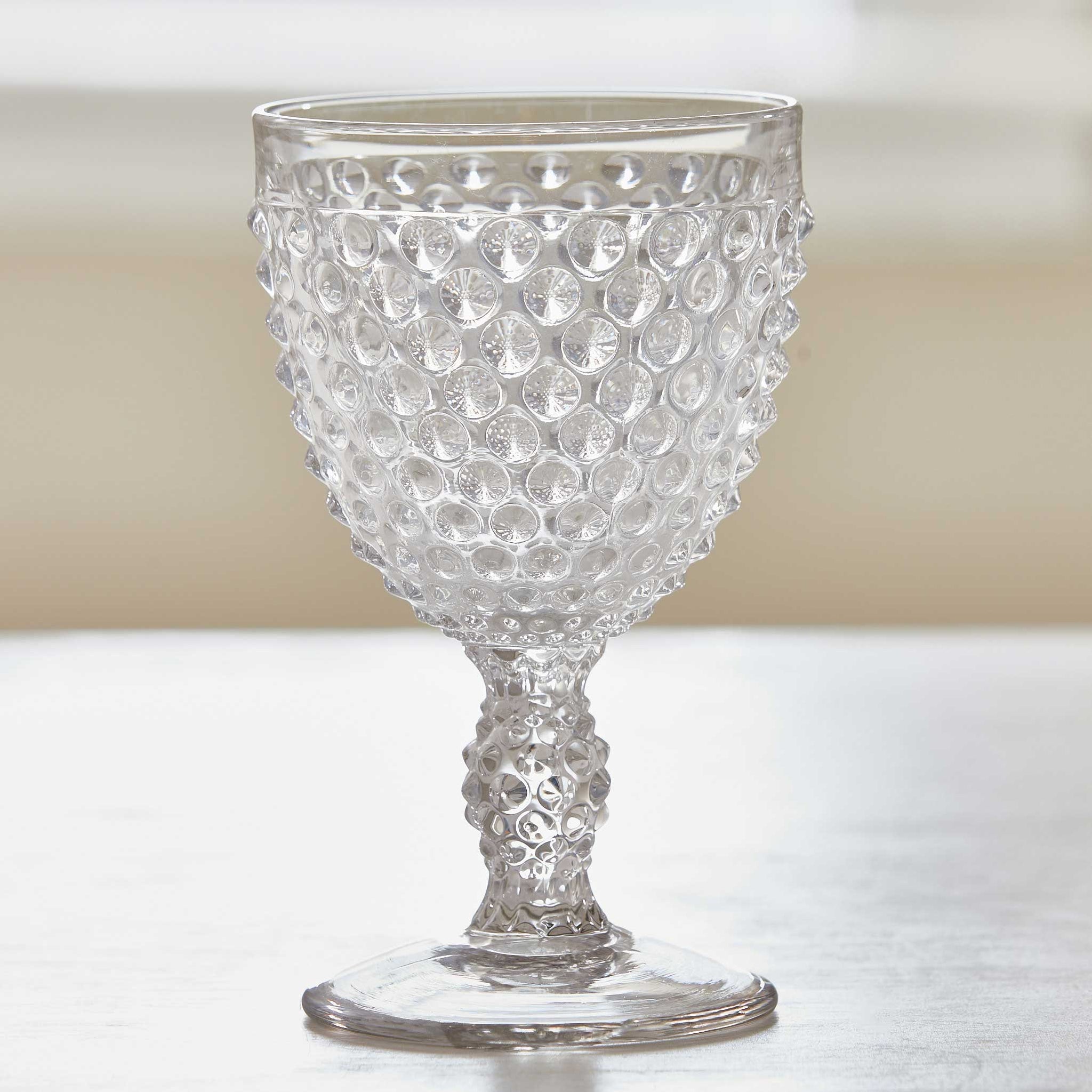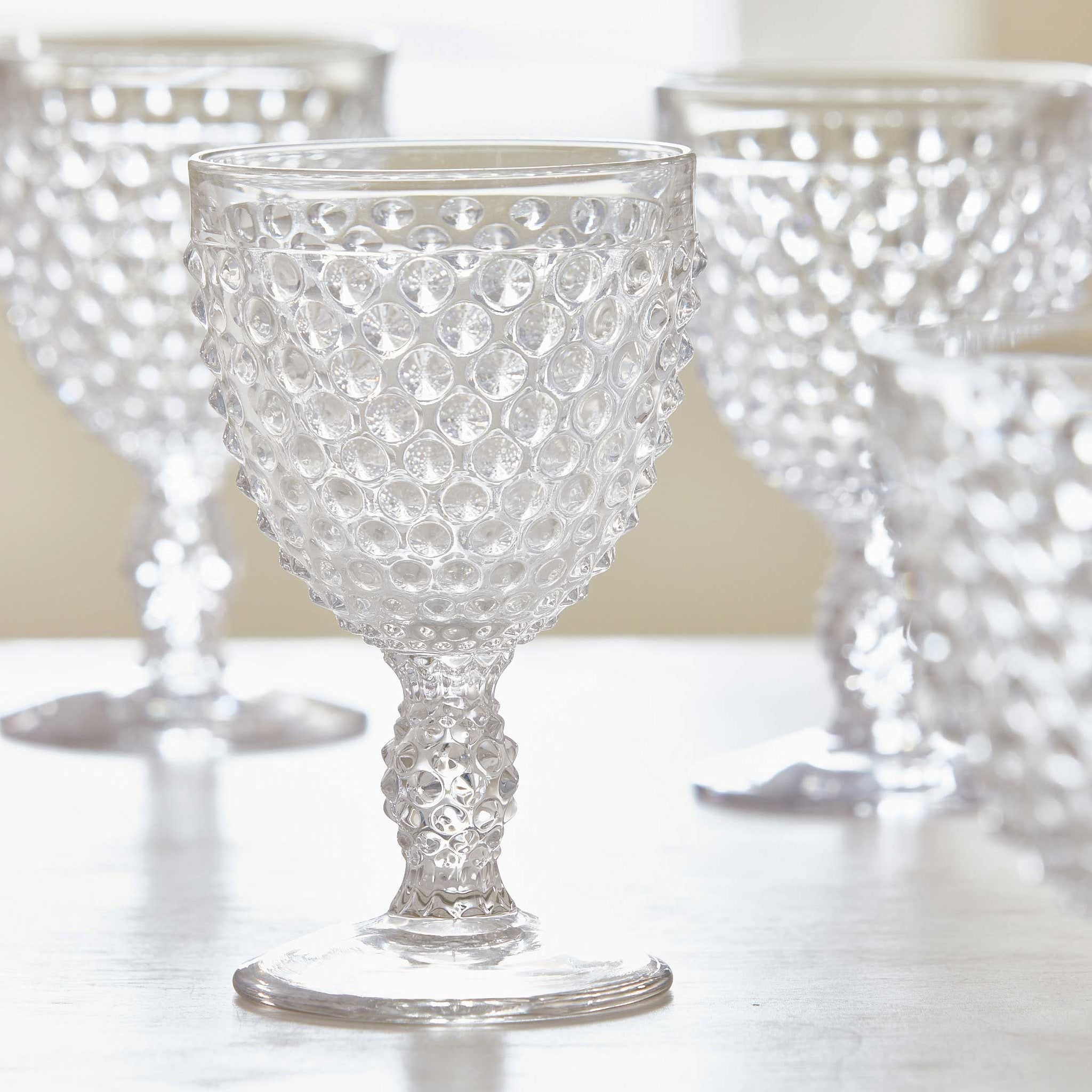 Hobnail glass originated in the 19th century when it was commonly known as "dew drop" glass because its pattern of raised bumps resembles dewdrops on a surface. Our vintage goblets have a textured hobnail decoration that encompasses both the bowl and the stem. The texture of the design also allows for a better grip on the glass, making it quite the practical choice for everyday.