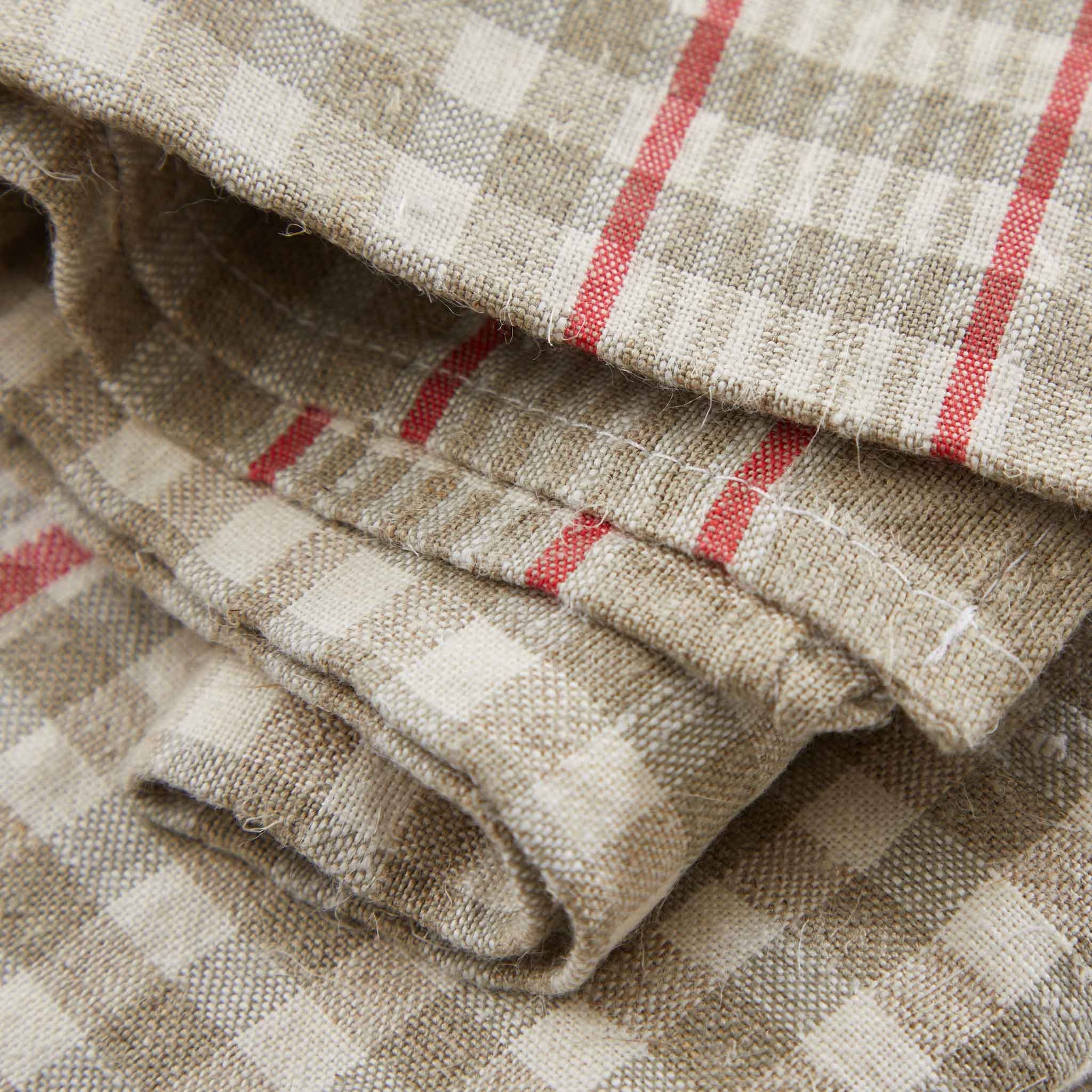 Pristine vintage French linens are always highly prized. Found in France, these traditional red and white plaid kitchen cloths are nearly square which allows them to live a double life, one as a towel and the other as an oversized napkin. French linen is made of European flax, which is known to be strong and durable, assuring that the cloths will stand the test of time.