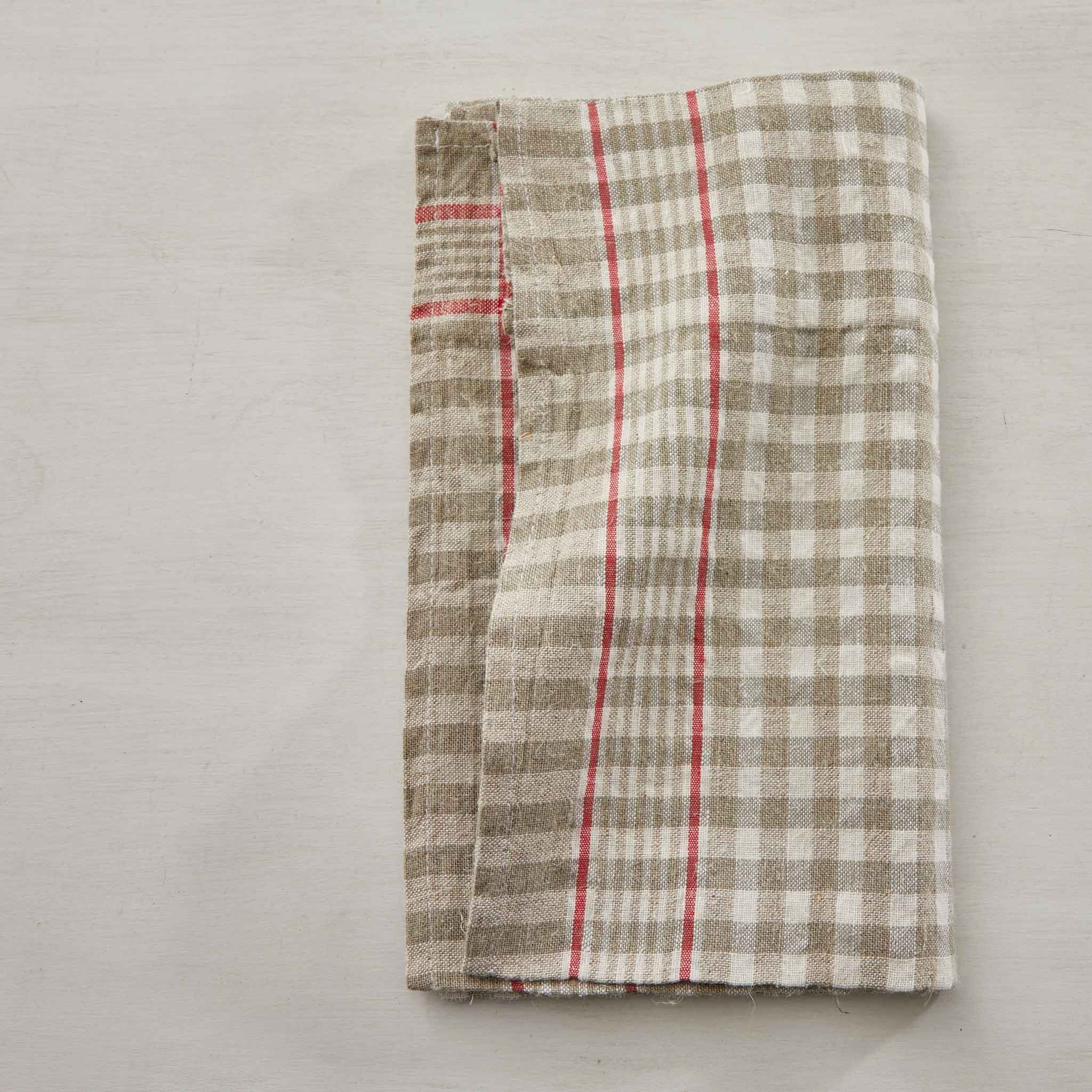 Vintage French Linen Kitchen Cloth - Grey Gingham w/ Red Stripe