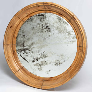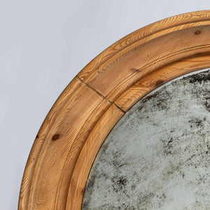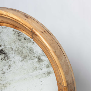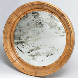 A very large round pine mirror with great presence. The mirror is chunky with great depth, the wood has a lovely patina, and the antiqued mirror adds to the overall character of the piece. Note that the portion of the glass that is not antiqued is mirror you can see yourself