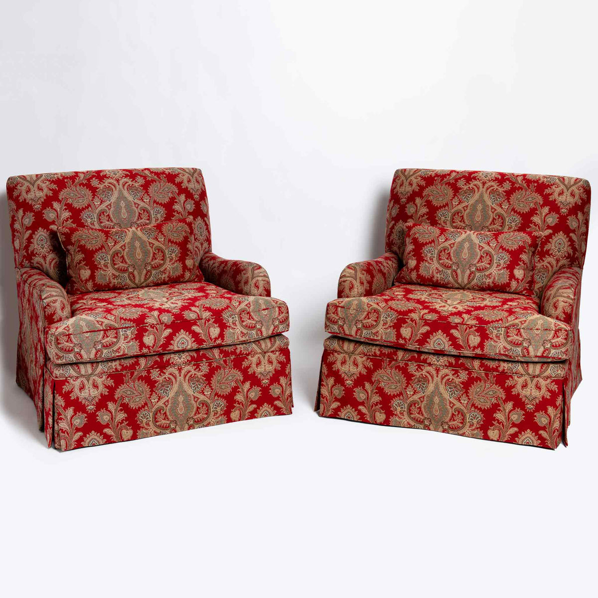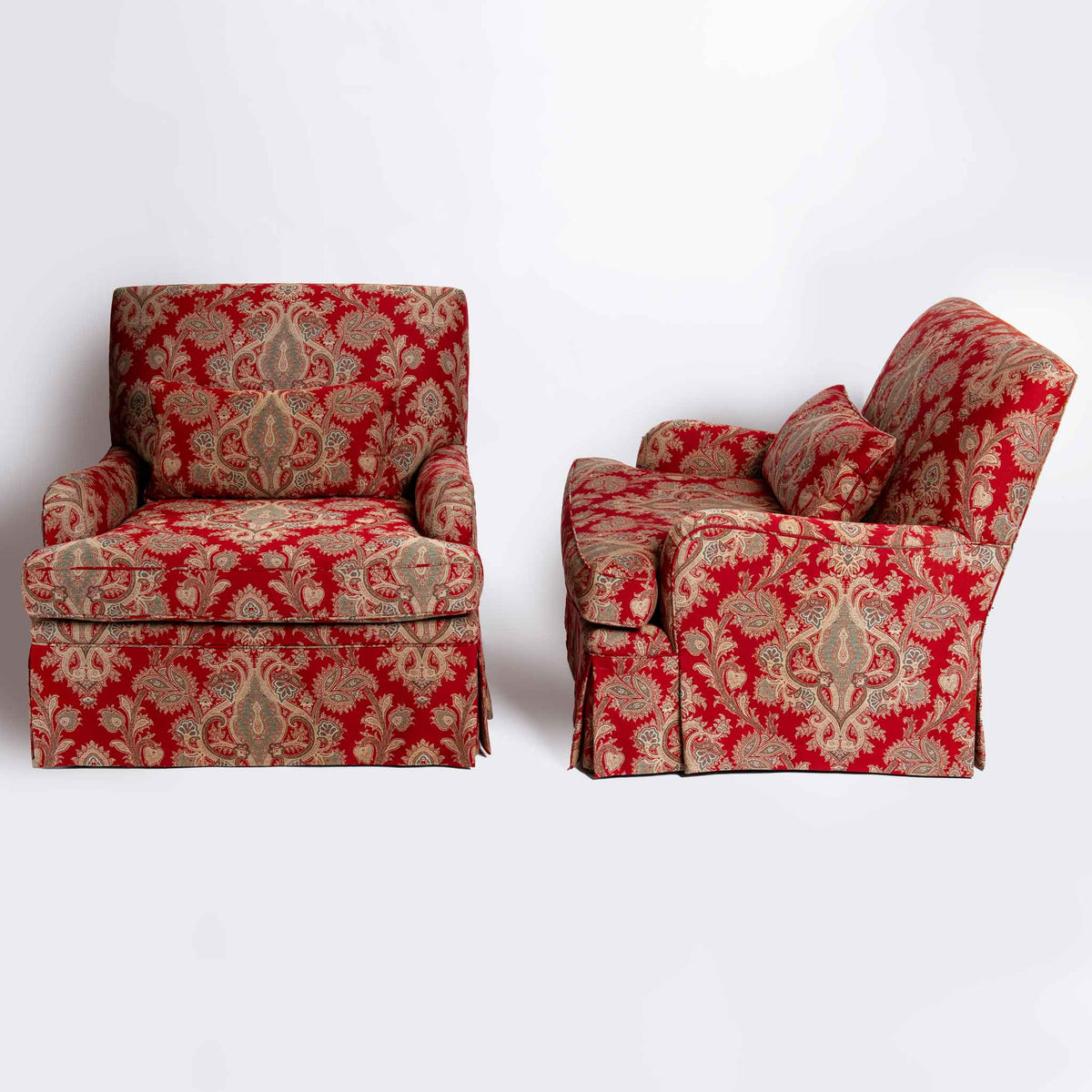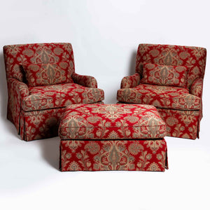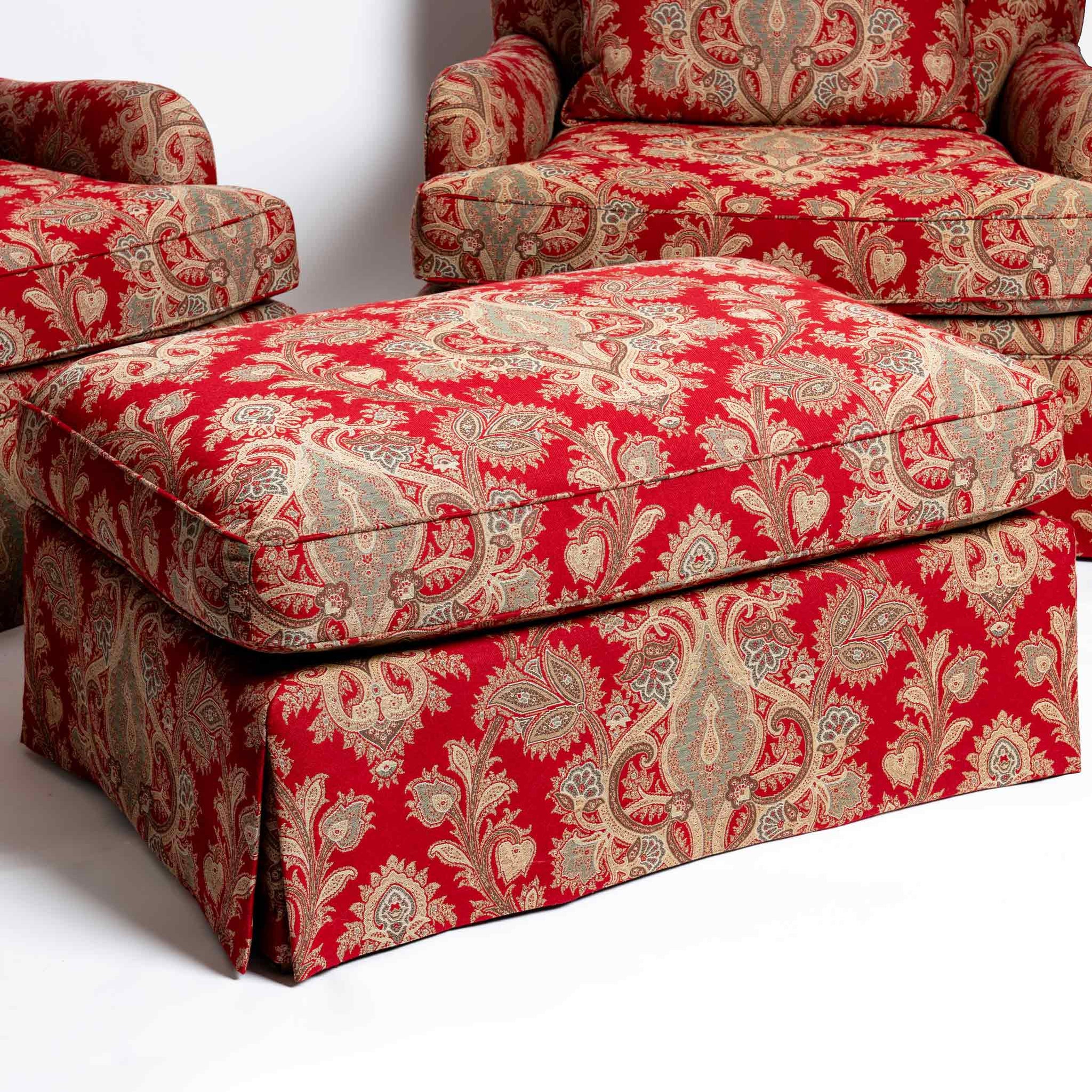 A very grand size pair of arm chairs with matching ottoman and 2 lumbar pillows. The chairs, ottoman and pillows are upholstered in what we believe to be a vintage Etro fabric (wool/wool blend) that is in perfect condition. Everything is beautifully upholstered and sewn and is all ready to place.