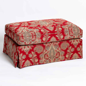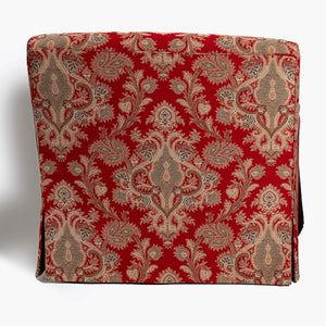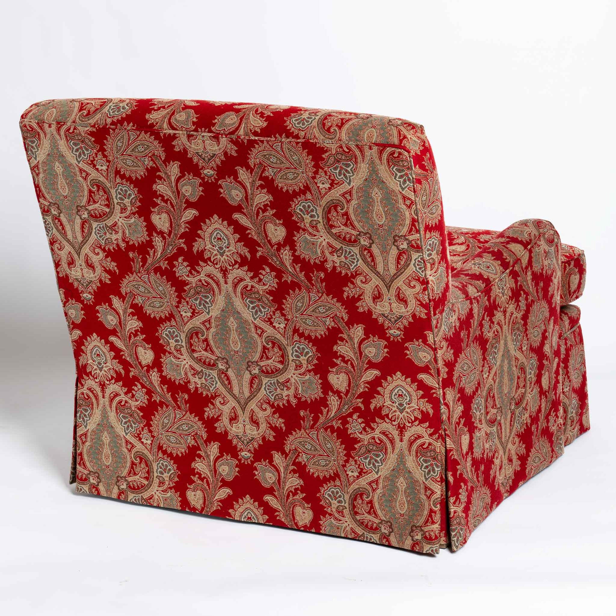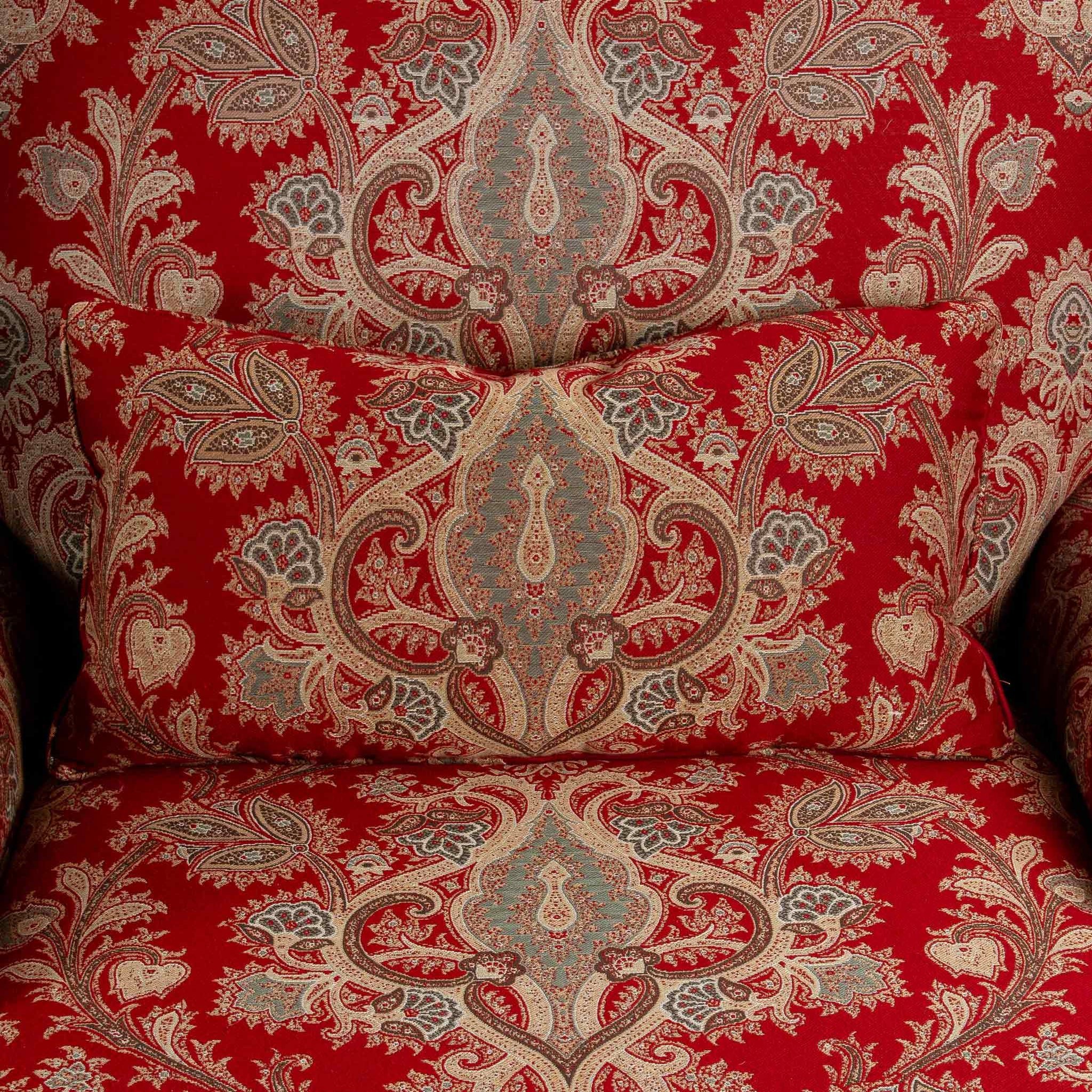 A very grand size pair of arm chairs with matching ottoman and 2 lumbar pillows. The chairs, ottoman and pillows are upholstered in what we believe to be a vintage Etro fabric (wool/wool blend) that is in perfect condition. Everything is beautifully upholstered and sewn and is all ready to place.