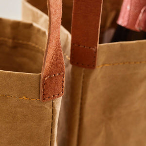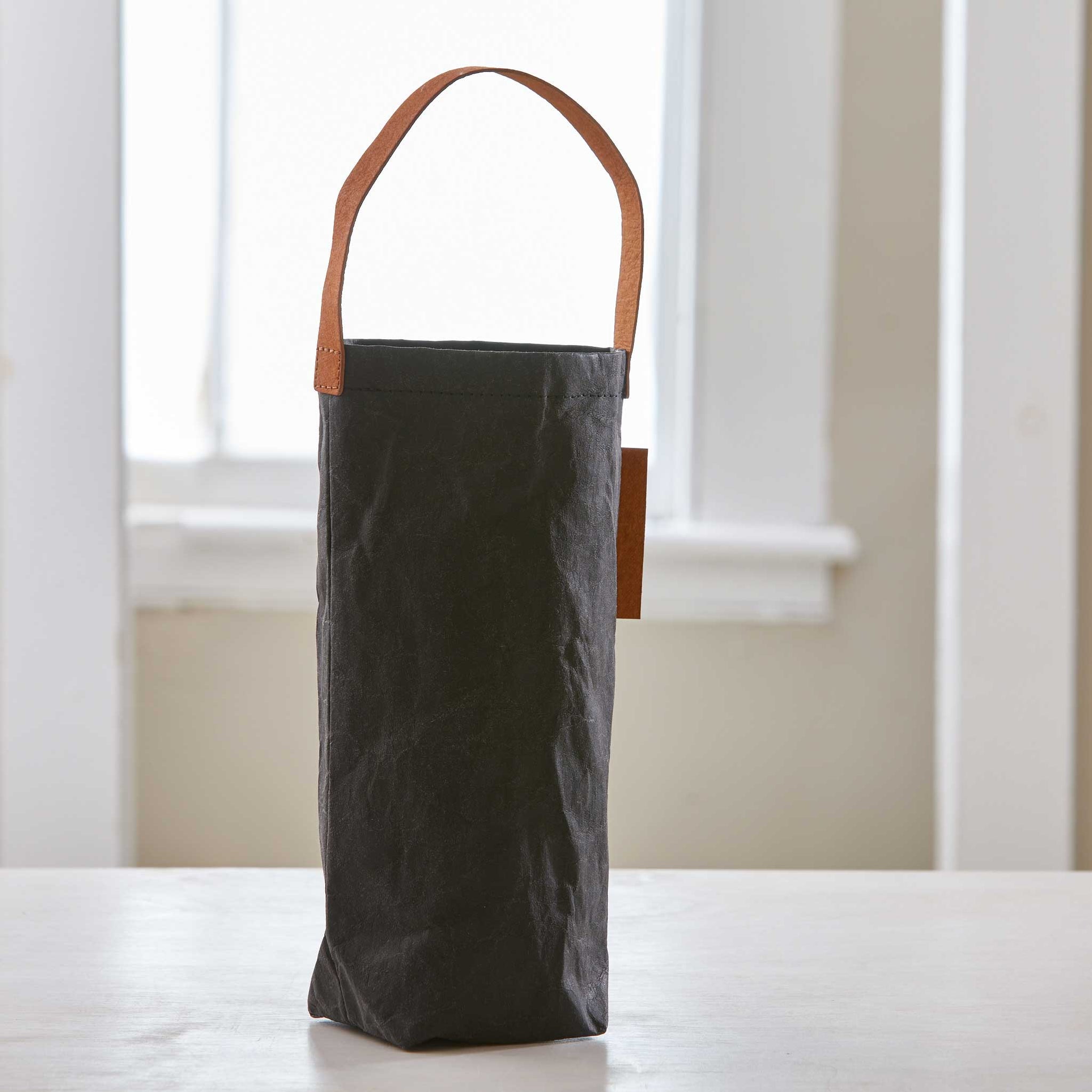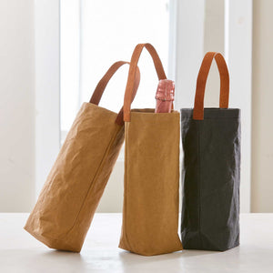 Resembling the aged charm of well-worn leather, this wine carrying sac is made in a sturdy, washable coated paper made of responsibly sourced renewable wood fibers. It certainly takes the gifting of wine or spirits to the next level. Customers rave about its handsome good looks, its durability and its sustainability. And...most folks buy them in multiples.